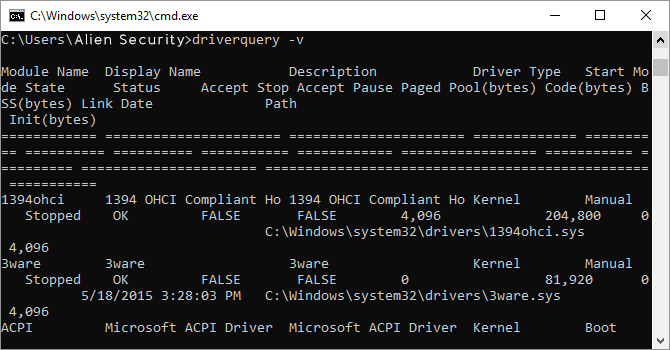 Drivers remain among the most important software installed on a PC. Improperly configured or missing drivers can cause all sorts of trouble, so its good to have access to a list of what’s on your PC. That’s exactly what the “driverquery” command does. You can extend it to “driverquery -v” to obtain more information, including the directory in which the driver is installed.